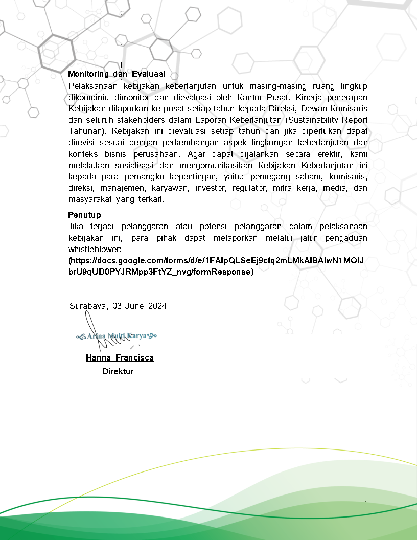 Through this policy, we are committed to implementing the concept of sustainability in every aspect of our business and operations. As part of the global effort to reduce greenhouse gas emissions, we are determined to support government programs and international initiatives through best management practices.